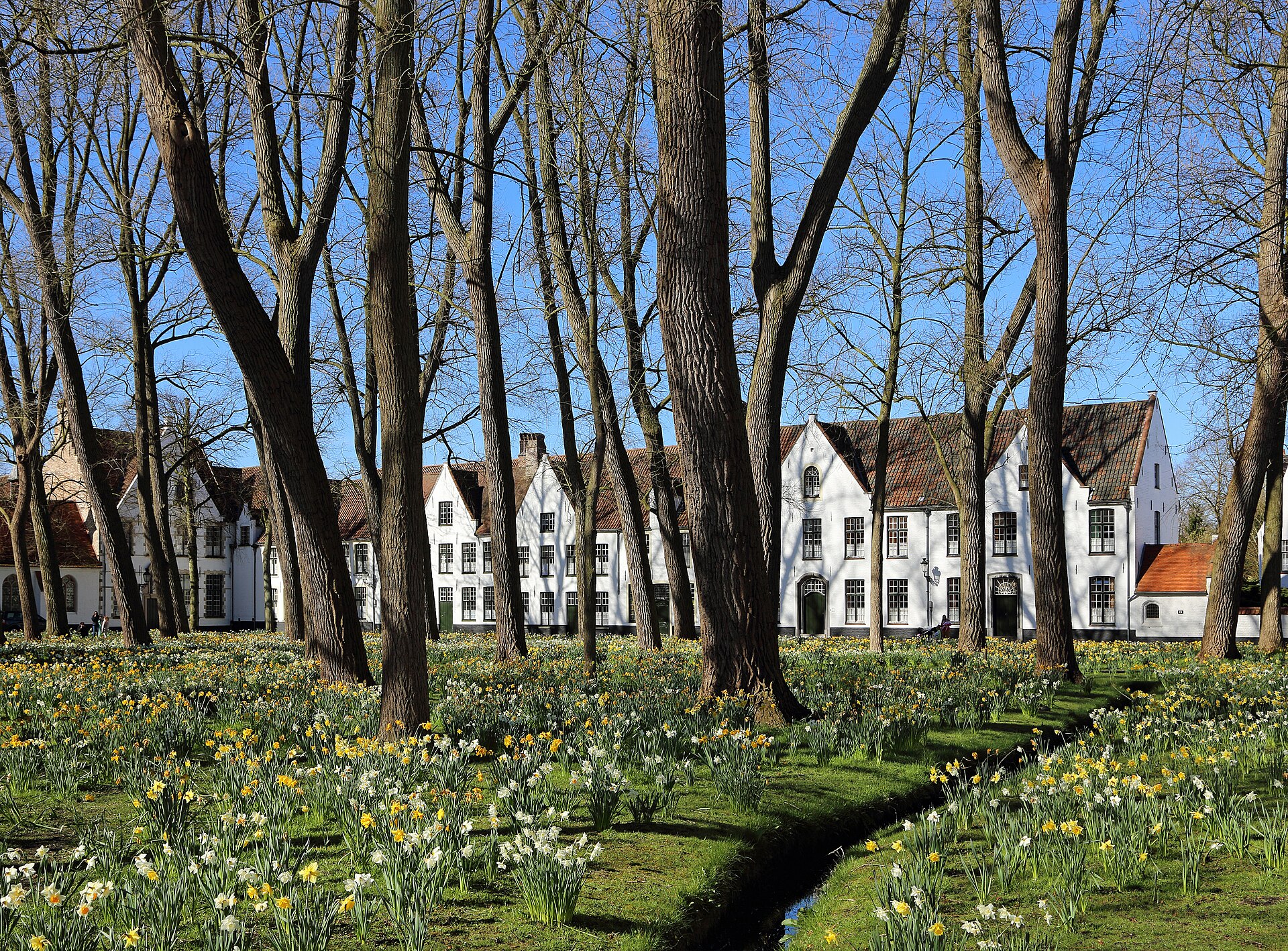 In the 13th century, an extraordinary social experiment emerged in the cities of Flanders. Women who wanted to live a religious life but did not want to take permanent vows — or who were widowed, or simply wanted independence from marriage — formed communities called beguinages. They were not nuns. They could own property, leave the community, and even marry. They answered to no bishop and followed no monastic rule. In an era when women's options were marriage, the convent, or destitution, the beguines carved out a fourth path. The Princely Beguinage Ten Wijngaarde in Bruges was founded in 1245 by Margaretha of Constantinople, Countess of Flanders. Its white-painted houses encircle a tranquil courtyard garden shaded by tall poplars and daffodils that bloom spectacularly each spring. In the 13th century, the beguines enjoyed the protection of Countess Joan of Constantinople, and by 1299, even the French King Philip the Fair had taken the beguinage under his jurisdiction — a sign of its wealth and political importance. The last beguine in Bruges died in 1927, and since then the houses have been occupied by Benedictine nuns who maintain the grounds with a quiet devotion that the original beguines would have recognised. The small beguine house museum in one of the cottages shows how a 17th-century beguine lived — a simple room with a bed, a prayer stool, and a lace-making pillow, because Bruges' beguines were famous lace makers. In 1998, the Bruges Begijnhof was inscribed as a UNESCO World Heritage Site along with twelve other Flemish beguinages. Walk through the entrance gate, cross the small stone bridge over the canal, and the noise of the city disappears. The grass is so perfectly maintained that there are signs asking visitors not to walk on it. Most people obey.