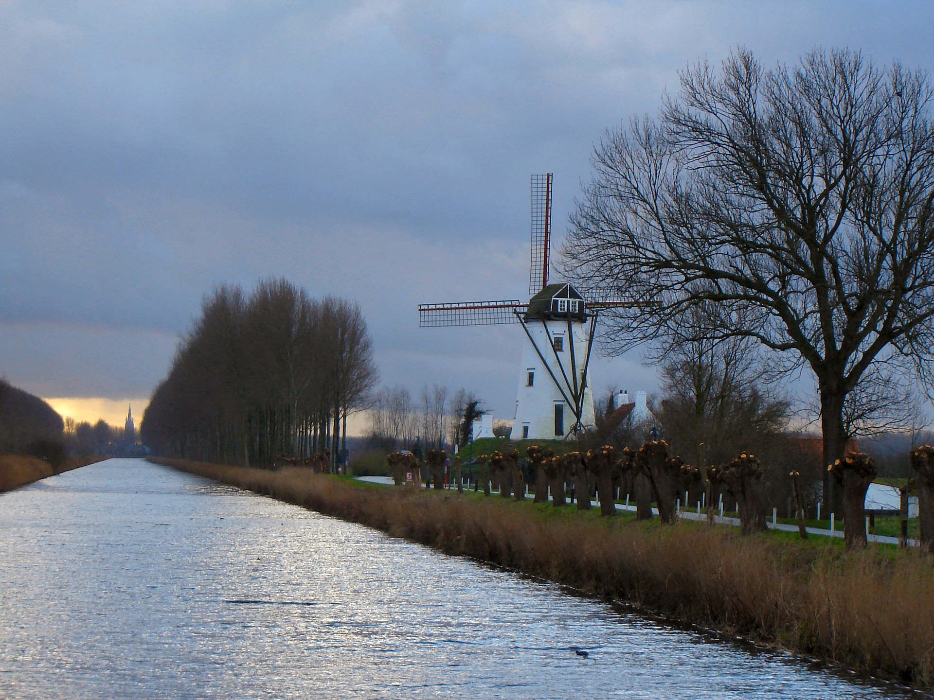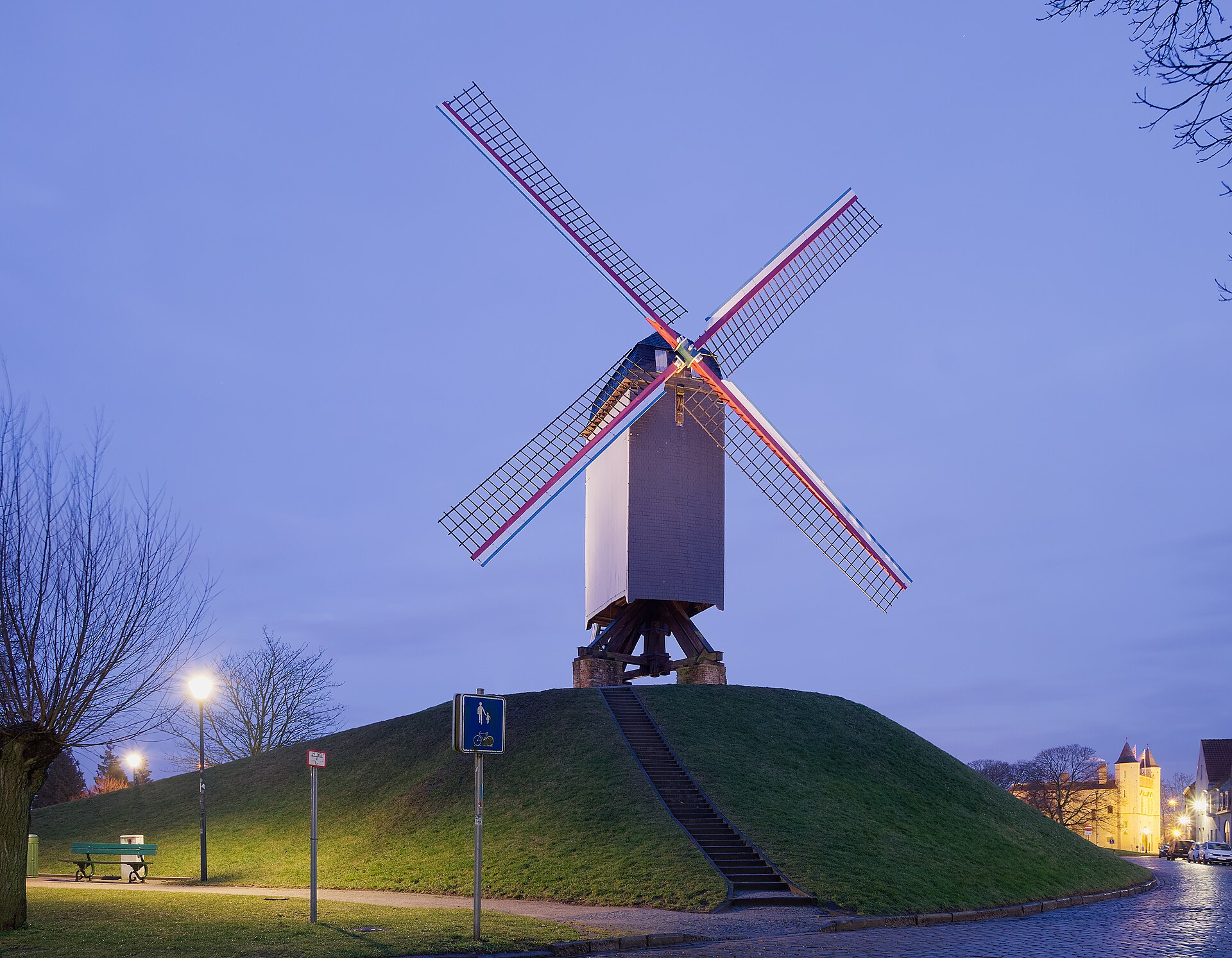 Windmills have graced Bruges' ramparts since the construction of the outer city wall at the end of the 13th century, and at the peak of their usefulness there were dozens spinning along the elevated earthworks. By the 20th century, they had all but disappeared. Today, four specimens survive on the Kruisvest — the green, tree-lined embankment that traces the northeastern city wall — and together they form one of the most photogenic walks in a city that is already almost unfairly photogenic. The star is the Sint-Janshuismolen, built in 1770 by a group of bakers who needed their own grain mill. It is the only one of the four windmills still standing on its original site, and more importantly, it is the only one where grain is still actually ground. In summer, you can climb inside and watch the mechanism work — the massive wooden gears, the grinding stones, the flour collecting below. It is a functioning piece of 18th-century engineering, maintained not as a museum exhibit but as a working mill. The other three windmills were relocated to Kruisvest from elsewhere in Flanders during the 20th century to preserve the memory of the city's milling past. The Bonne Chiere Mill, the De Nieuwe Papegaai Mill, and the Koelewei Mill (dating from 1765) were all transplanted here to maintain the windmill-studded skyline that appears in old paintings and engravings of the city. The walk along the Kruisvest from the windmills toward the Dampoort gate is one of Bruges' best-kept secrets. Away from the crowds of the Markt and the Burg, you are walking along the top of the old city wall, with views across the canal to the quiet suburbs on one side and the medieval rooftops on the other. Bring a picnic.
