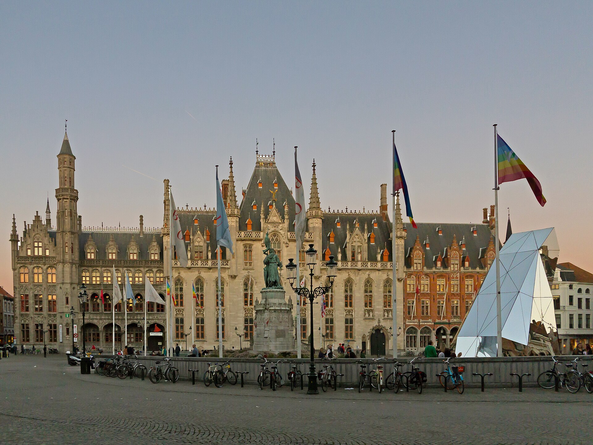 This is where Bruges puts on its best medieval face, and it has been doing so for over a thousand years. The Markt has served as the city's central marketplace since at least 958, when Count Arnulf I granted the right to hold a weekly market here. For centuries, this was the commercial engine of one of Europe's wealthiest cities — a place where Flemish cloth was traded, fortunes were made, and political power was displayed with architectural swagger. At the centre stands a bronze statue of Jan Breydel and Pieter de Coninck, erected in 1887 by sculptor Paul De Vigne. These two men — a butcher and a weaver — are celebrated as heroes of the 1302 Bruges Matins, when Flemish citizens rose up against their French occupiers. The revolt led to the Battle of the Golden Spurs on July 11 of that year, where an army of Flemish craftsmen and farmers defeated the flower of French knighthood near Kortrijk. That date is now the official holiday of Flanders. Whether Breydel and de Coninck played quite the heroic roles the statue suggests is debatable — the historical record is thin — but the myth has stuck. The square is dominated by the neo-Gothic Provinciaal Hof on the eastern side, built between 1887 and 1920 on the site of the old Waterhalle, a medieval covered port where boats once unloaded goods directly into the centre of town. The Waterhalle was demolished in 1787 after the waterways silted up, and the neoclassical replacement burned down in 1878. What you see now is essentially a Victorian fantasy of what a medieval government building should look like, clad in 68,000 terracotta tiles. The colourful guild houses lining the square may look ancient, but most facades are 19th-century reconstructions. Still, when the morning light hits the stepped gables and the carillon rings from the Belfry, it is easy to forget that some of this is restoration rather than original. The Markt sells the illusion of the Middle Ages so convincingly that the illusion becomes its own kind of truth.