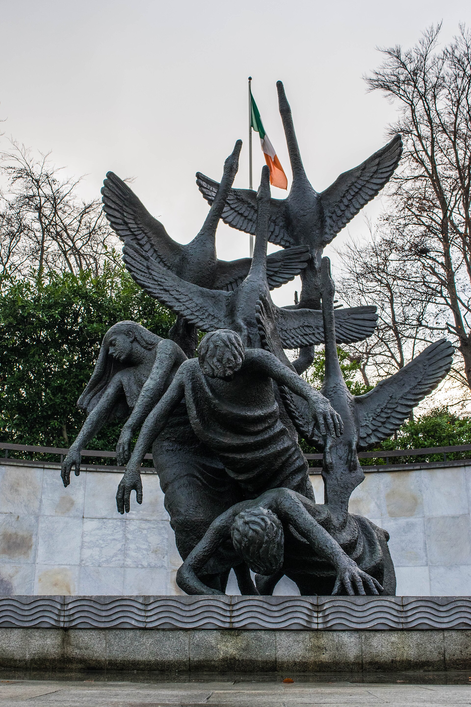 This quiet memorial garden at the north end of Parnell Square is dedicated to everyone who died in the cause of Irish freedom, and the ground it sits on has earned that dedication several times over. This is where the Irish Volunteers mustered on the eve of the 1916 Rising. Before that, the Rotunda Gardens that occupied this spot saw some of the most important political gatherings in Irish history. Designed by architect Daithi Hanly and opened by President de Valera on April 10, 1966 — exactly the 50th anniversary of the Rising — the garden is built around a sunken cruciform pool lined with mosaic tiles in blue and green wave patterns. Interrupting the waves are tiled representations of broken weapons, drawing on the Celtic tradition of marking the end of battle by throwing weapons into rivers. It's a subtle, powerful symbol that most visitors walk right past. The focal sculpture is Oisin Kelly's Children of Lir, installed in 1971. Based on one of Ireland's great mythological stories, it depicts the moment the children — cursed to spend 900 years as swans — are finally transformed back to human form. The myth is about suffering and redemption, which makes it a pointed choice for a memorial to political martyrs. One of the garden's most significant moments came on May 17, 2011, when Queen Elizabeth II laid a wreath here during the first state visit by a British monarch to the Republic of Ireland. She bowed her head in silence at a memorial to people who had fought against British rule. The gesture was widely praised as a profound act of reconciliation. Sometimes a quiet garden says more than any speech.