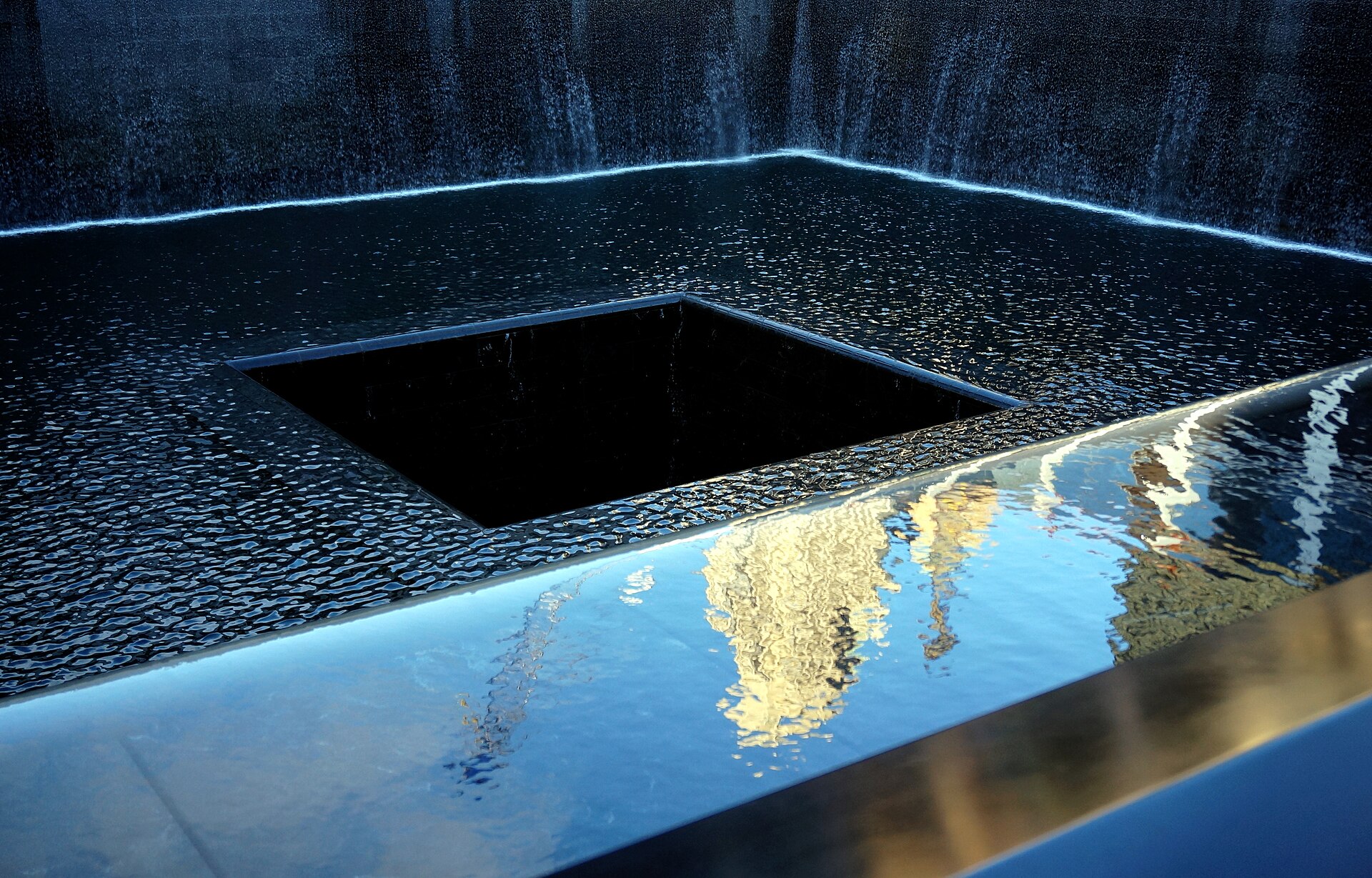 The two reflecting pools sit in the exact footprints of the Twin Towers. Each one is nearly an acre in size. Water cascades thirty feet down the sides, then drops another twenty feet into a central void. The architect, Michael Arad, described them as "absence made visible." Although water flows continuously into the voids, they can never be filled. Bronze panels around the edges of each pool are inscribed with the names of every person killed in the September eleventh two thousand and one attacks and in the nineteen ninety-three World Trade Center bombing. The names are not arranged alphabetically — they are placed according to where people were and who they were with, so that colleagues and friends appear together. Near the south pool stands the Survivor Tree — a callery pear that was pulled from the rubble in October two thousand and one. It was eight feet tall, badly burned, with one living branch. The Parks Department moved it to a nursery in the Bronx where it was nursed back to health. In December two thousand and ten, the tree — now thirty feet tall — was returned to the site. Each year, the memorial gives seedlings from this tree to communities that have experienced terrorism, violence, or natural disasters. The four hundred swamp white oaks surrounding the pools were chosen because the species is native to all three crash sites: New York, Arlington, and Somerset County, Pennsylvania. The memorial plaza is free and open daily.